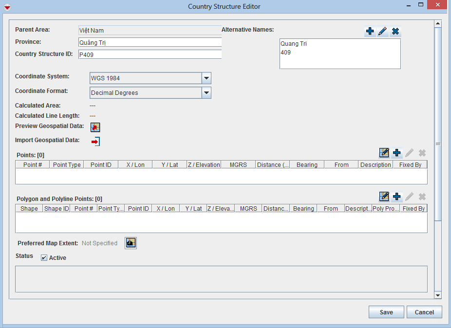 - When the extent of the Map pane is the desired, click the Capture button. The Country Structure Editor window’s Preferred Map Extent field changes to Captured.