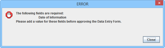 If any data fields in the Data Entry Form that is set to be required are not filled in, you will be notified and these fields need to filled in before the Data Entry Form may be Approved.