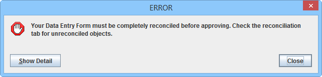 If the Reconciliation tab is not populated correctly or incompletely, you will be notified and it has to be corrected before the Data Entry Form may be Approved.