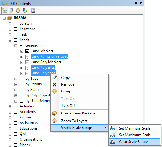 1. Open IMSMA.mxd with ArcMap and go to the group or layer you would like to change visible scale range for.
