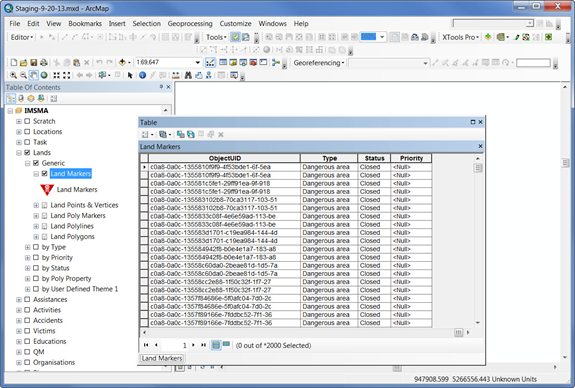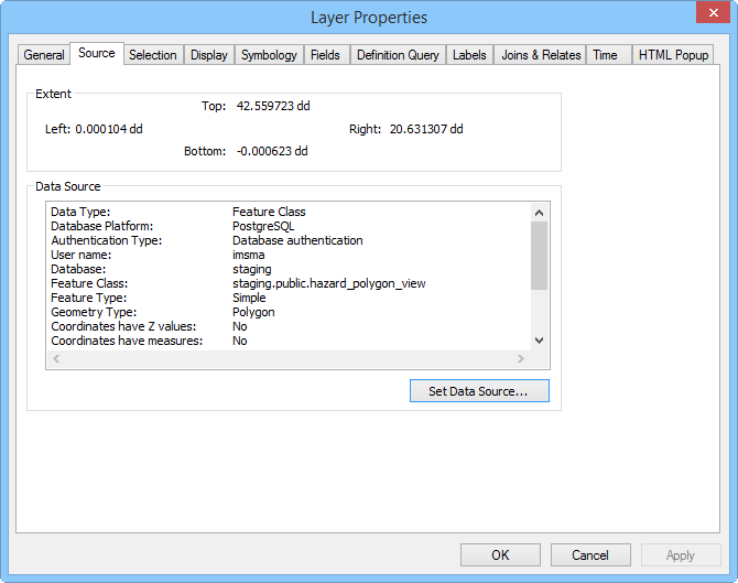 There is also a special mxd-file, staging.mxd, that contains the IMSMA symbology and has Data Source set to a PostgreSQL database called staging for all layers. You find the staging-MM-DD-YY.mxd in C:\IMSMAETLTool\data. The visible scale ranges in staging-MM-DD-YY.mxd are the same as in IMSMA.mxd.