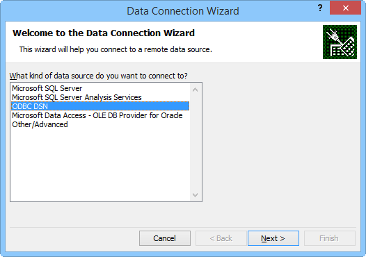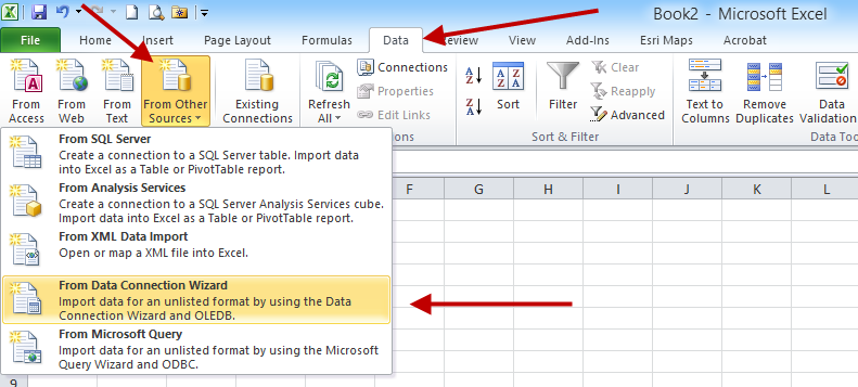 1. On the Data tab, click on From Other Sources and choose From Data Connection Wizard.
