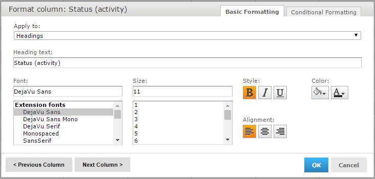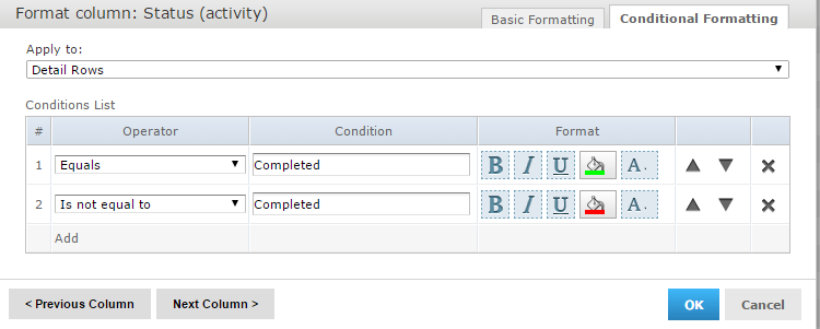 - Conditional formatting: this dialog box allows to apply conditional formatting, i.e. apply styles such as text size, text colour and fill colour, based on certain criteria. For example, the background fill colour can be adapted to the value of the status attribute, as shown in the screenshot below: