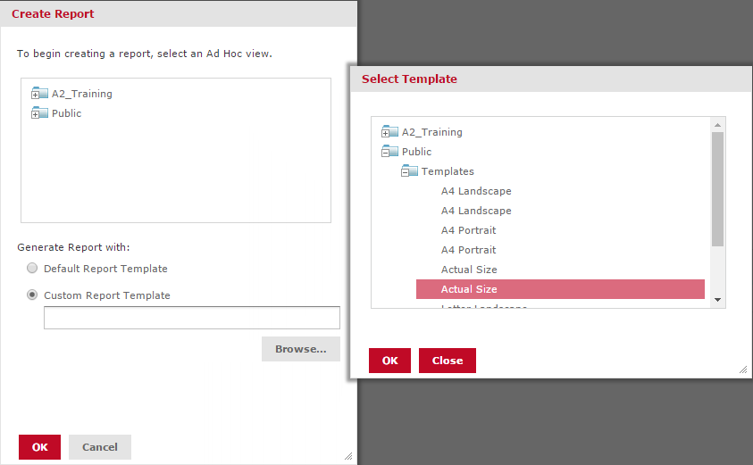 - When creating and saving the ad hoc view, click on the Save Ad Hoc View and Create Report option. A dialog then prompts for a name and location not only for the ad hoc view, but also for the report. As a result, the ad hoc view is then saved as a report in the specified repository location.