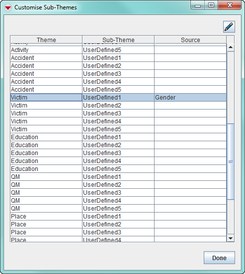 2. Each theme contains five blank rows for adding a sub-theme. These are labelled UserDefined1, UserDefined2, UserDefined3, UserDefined4, and UserDefined5.