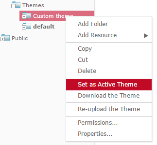 Once more than one theme is available in one organisation on MINT, the administrator can switch between themes by highlighting one, right-clicking, and choosing Set as Active Theme.