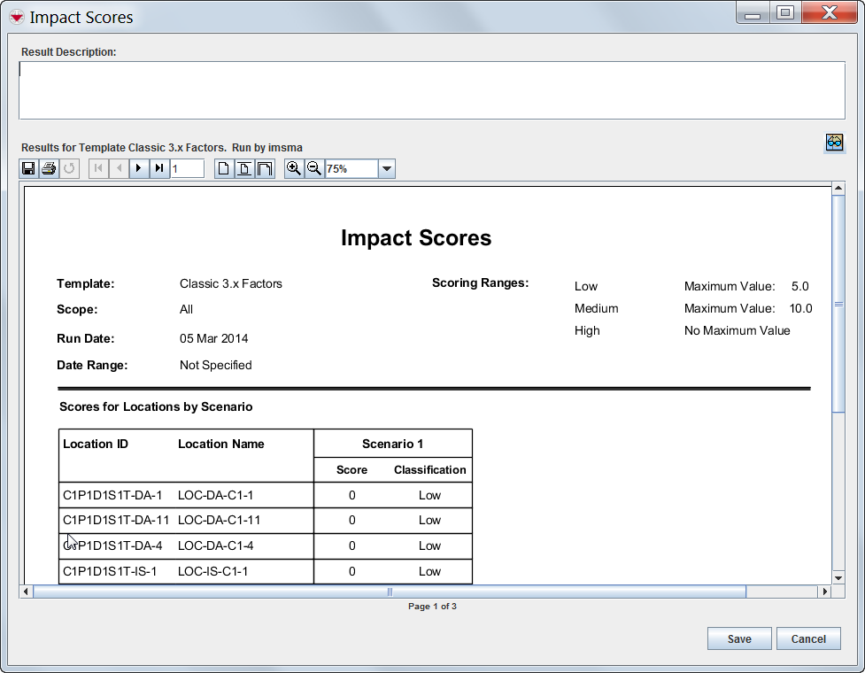 If you click the Save button, the results will be saved in the Past Results section of the Impact Scoring window.