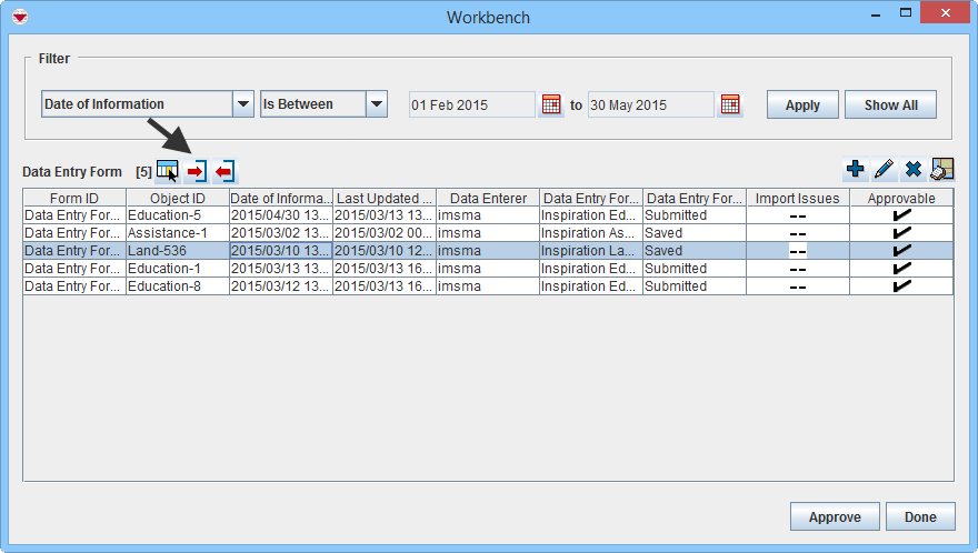 2. If a data entry form was not approved, open the Workbench window and double-click the row associated with the unapproved data entry form.