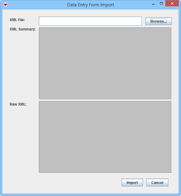 2. If the import file method is used, the number of data entry forms and the number of objects associated with the reports are displayed in the XML Summary section of the window. The contents of the file are displayed in the Raw XML View section.