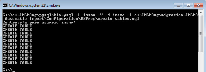 2. Entre el siguiente comando: c:\IMSMAng\pgsql\bin\psql -U imsma -W -d imsma -f c:\IMSMAng\migration\IMSMA_Automatic_Import\Configuration\DBPrep\create_tables.sql