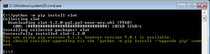 3. Entre el siguiente comando python -m pip install xlwt y pulse Enter