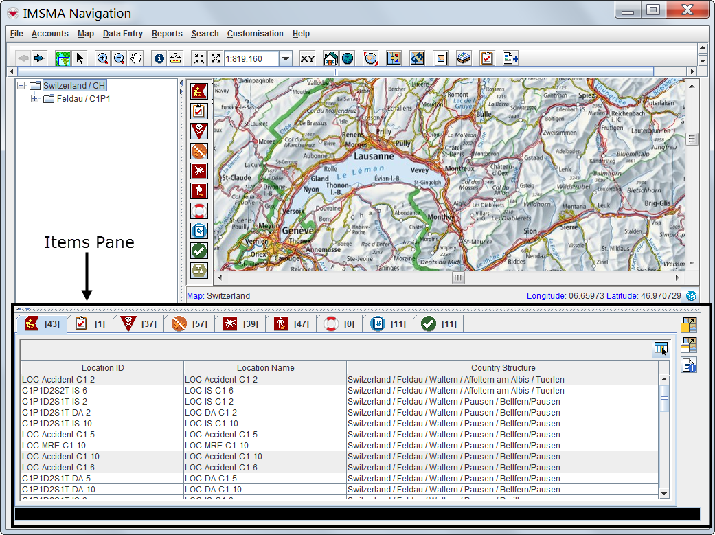 The Items pane of the IMSMA Navigation Window consists of tabs that display the different approved items and a toolbar to the right. These buttons interact with the map. The number displayed in brackets on each item tab is the number of items in the selected Country structure.