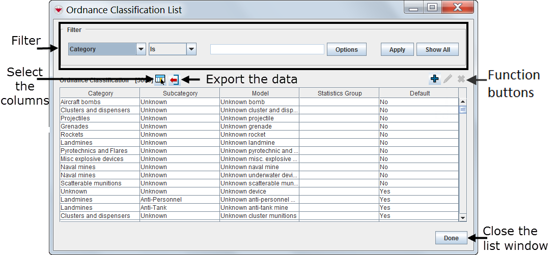 Depending on which data is displayed in the List Window there are different function buttons: