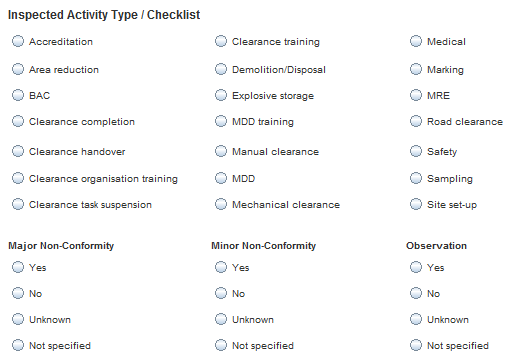 When IMSMA is used on a national level normally only the external inspections are entered with the signed checklists as attachments. With other words, instead of making a Data Entry Form for each type of inspection/checklist, only one QM template is created. It contains a fields for type of inspection is done, major/minor conformity and other fields that most checklists have in common and are valuable for follow up. All other information is in the attachment.