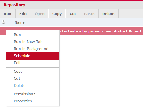 1. In the repository, right-click on a report and select Schedule...