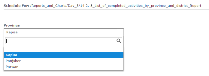2. Parameters: this tab is only enabled if the report to be scheduled has input controls (filters). If there are any, then the values for those input controls need to be specified. In this example, the report has the following parameters: a start date between two date values, a type of activity and a province. A value needs to be specified for each of those parameters.