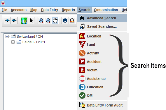 The Search menu also contains a function for searching events in the Approval workflow, Search the Data Entry Form Audit Log.