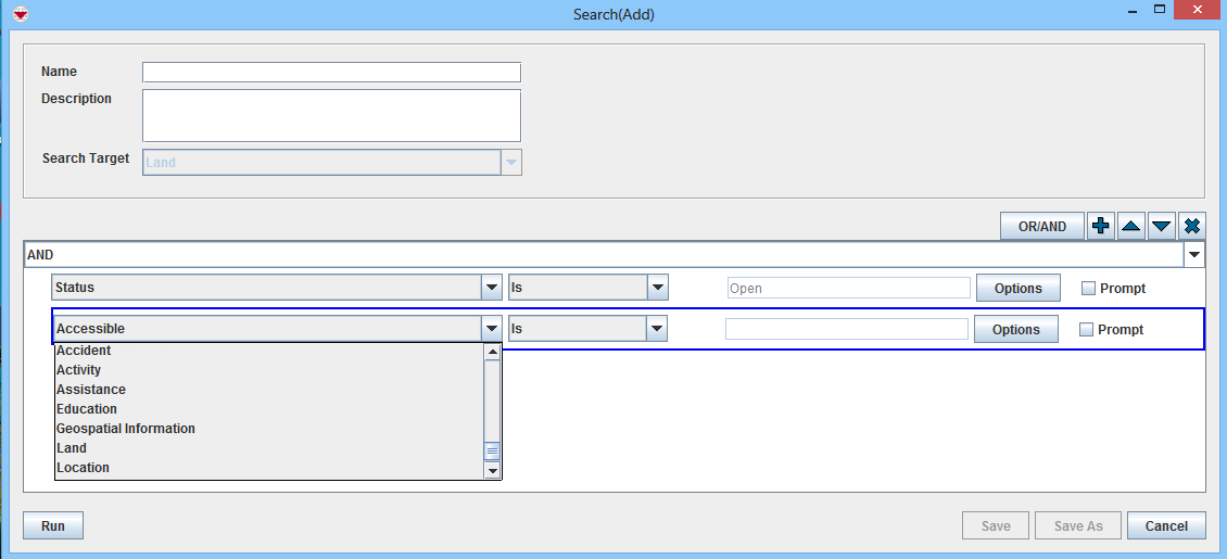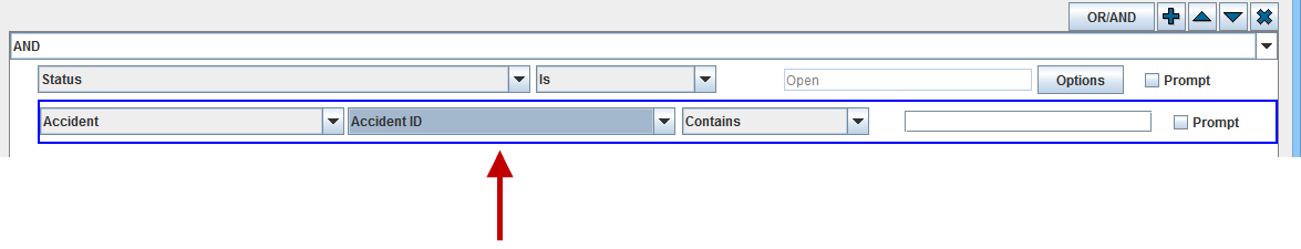 3. Add one more criterion and select from the drop down list the linked item. In this example we use Accident.