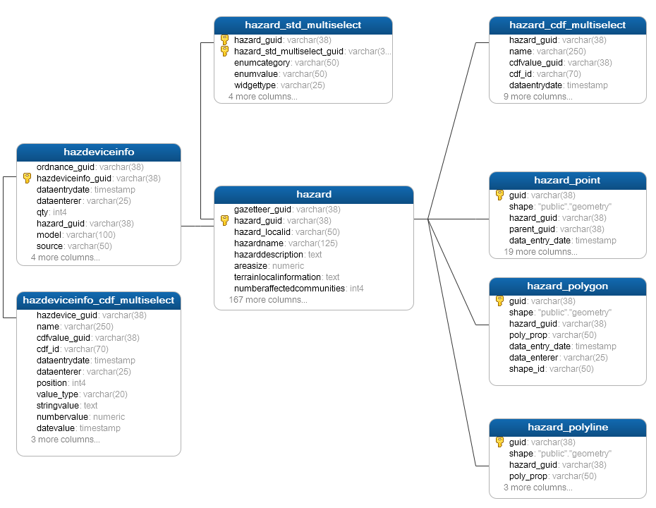 A series of database views are pre-defined on the staging area, three for each object: <OBJECT>_POINT_VIEW, <OBJECT>_POLYGON_VIEW and <OBJECT>_POLYLINE_VIEW - where <OBJECT> is HAZARD, GAZETTEER, MRE, etc. - each object that potentially has associated geodata. Each view is defined as an INNER JOIN between the <OBJECT> table, e.g. HAZARD, and each of the three geodata tables. The inner join means that data from e.g. the HAZARD table that has no polygon associated will not be found in the HAZARD_POLYGON_VIEW. Depending on the use case, either the tables or the views can be accessed.