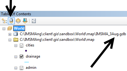12. Click on the second tab List by Source and verify that IMSMA_3Aug.gdb is used.