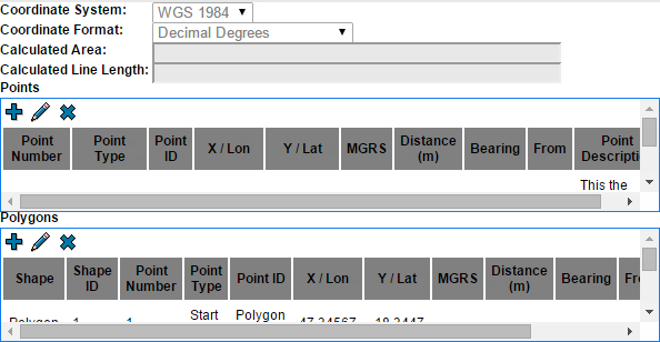 Coordinate system and format are comboboxes with automatic width. IRE does not have any functionality for calculating area and length. The buttons are included in the tables which leaves less place for the coordinate rows. The widget do not require both tables in IRE. Height 101 (Bold 12)