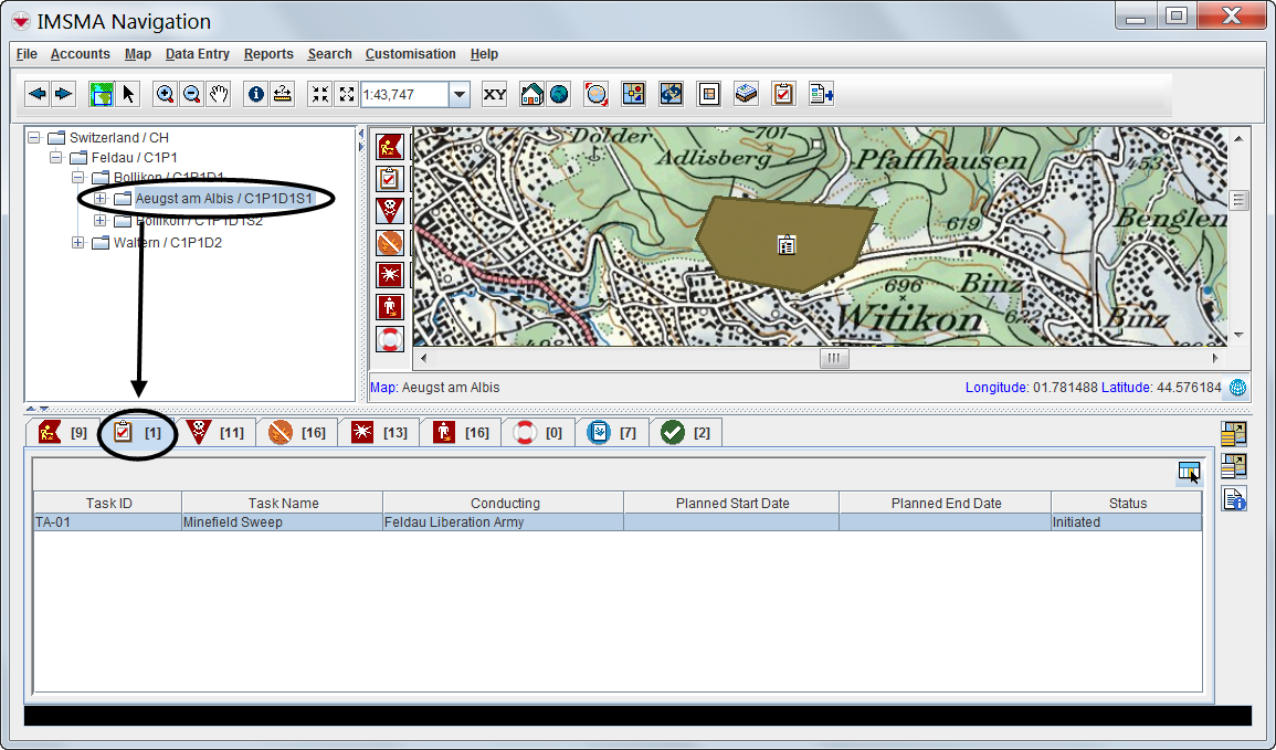 Tasks allow you to manage work that is required as part of your mine action process. You can link tasks to standard IMSMA items or to specific areas on the map, assign task objectives and sub-tasks (called work items), and record other work-related information such as start and end dates, available resources, responsible personnel, and status changes.