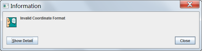 The following error message indicates that you either did not enter coordinates, or the coordinates that you entered were not in a valid format. Click on Show Detail for more information. Click the Close button and enter valid coordinates.