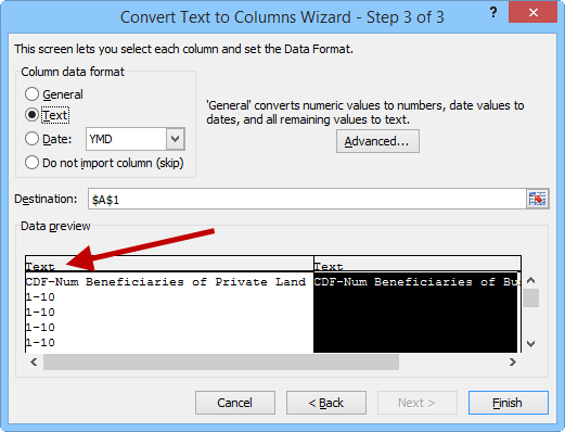 15. Change Column data format to Text and verify that the format is set to Text for the columns that Excel otherwise will change to the wrong data type or data format.