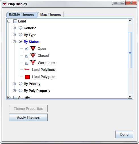 In IMSMANG version 6.0 it is not possible to change the IMSMA.mxd to show different colours of the polygon based on Type, Status, etc. i.e. it is not possible to have red for Open, Orange for Worked on and Red for Closed. But it is possible to change how to polygon looks like in IMSMANG.
