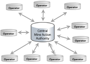 The decentralised model with Regional Mine Action Centers is characterised by one or more regional sites that conduct data entry and data quality control for their region. Regional sites also typically perform some regional data analysis designed to support regional operations management and planning. By contrast, the Central Mine Action Authority manages the overall data set for the entire country, collecting all regional information in order to perform national planning and produce national statistics.