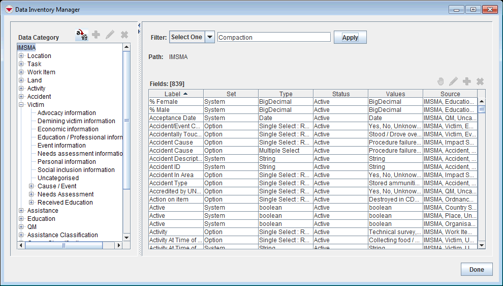 • It is possible to search the whole database by selecting the top node IMSMA in the left pane.